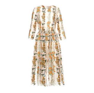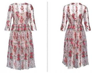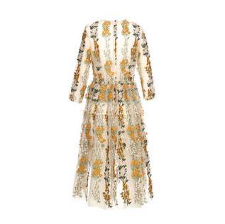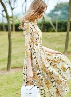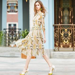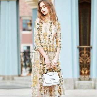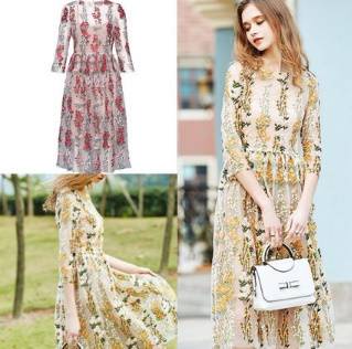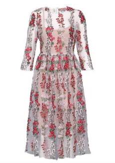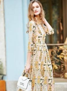 ロングドレス 袖あり パーティードレス ワンピースドレス 春夏 デート 記念日 女子会 ピンク イエロー 大きいサイズ ロング丈 ミモレ丈 五分袖 半袖 Aライン フレア 刺繍 レース 花柄 透け感 シースルー ラウンドネック 20代 30代 大人かわいい フェミニン ガーリー