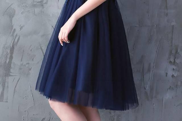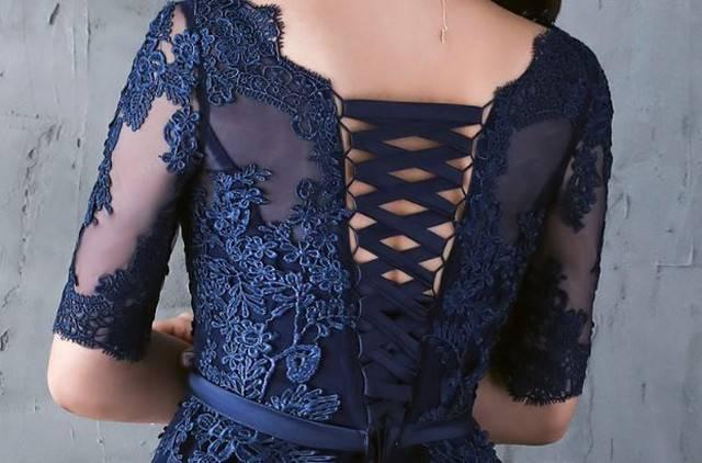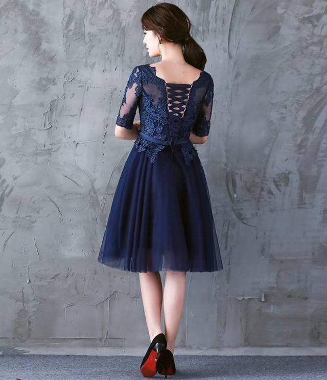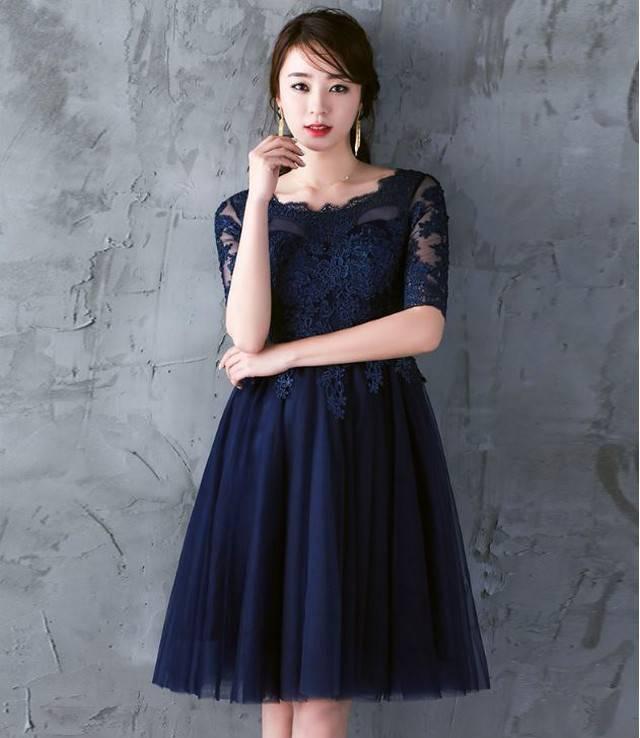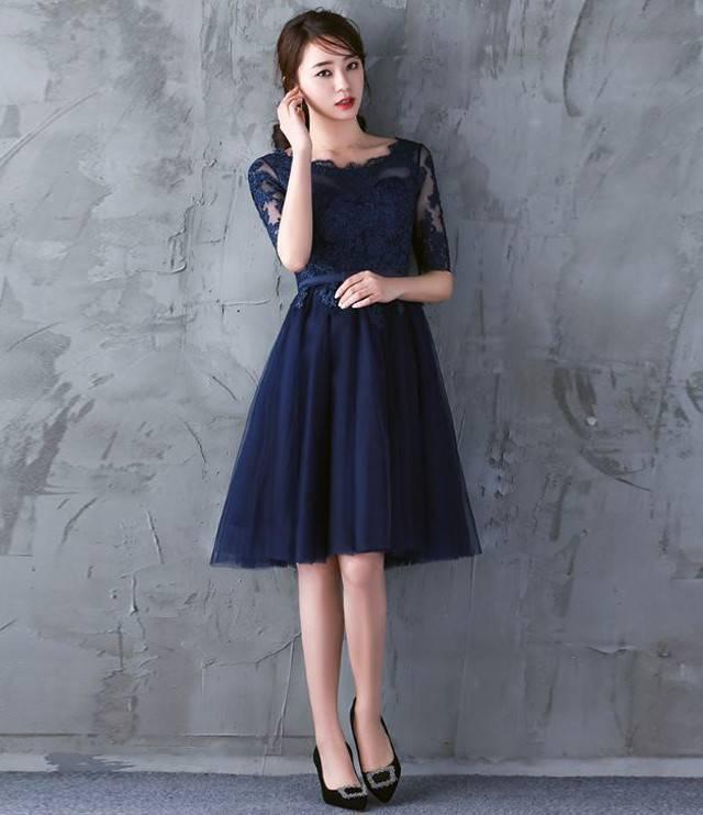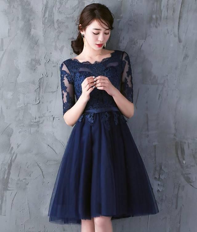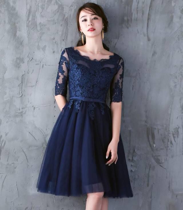 パーティードレス イブニングドレス 春夏 結婚式 二次会 披露宴 ネイビー 大きいサイズ ひざ丈 半袖 袖あり Aライン Xライン フレア 刺繍 レース 花柄 透け感 シースルー ラウンドネック 20代 30代 大人かわいい フォーマル フェミニン ガーリー