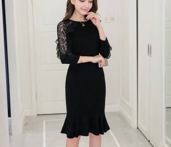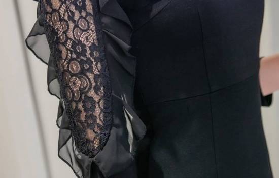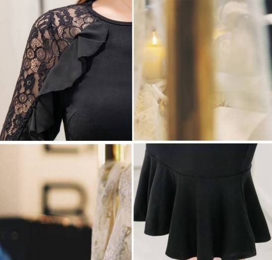 ワンピース ひざ丈 レディース パーティードレス ブラック ペプラム カクテルドレス 袖レース タイト スリム エレガント 大人