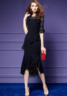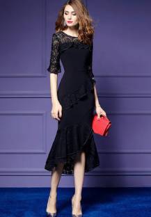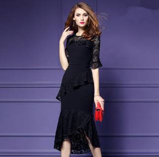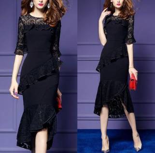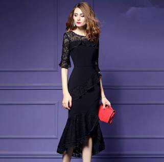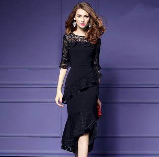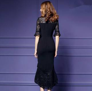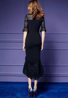 ロングドレス 黒 パーティードレス イブニングドレス 春夏 結婚式 二次会 披露宴 ブラック 大きいサイズ ロング丈 ミモレ丈 五分袖 半袖 袖あり Iライン マーメイドライン タイト 刺繍 総レース 花柄 透け感 シースルー ラウンドネック 30代 フォーマル