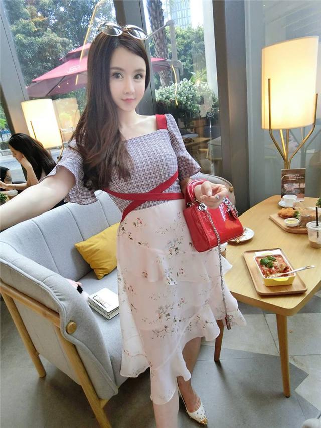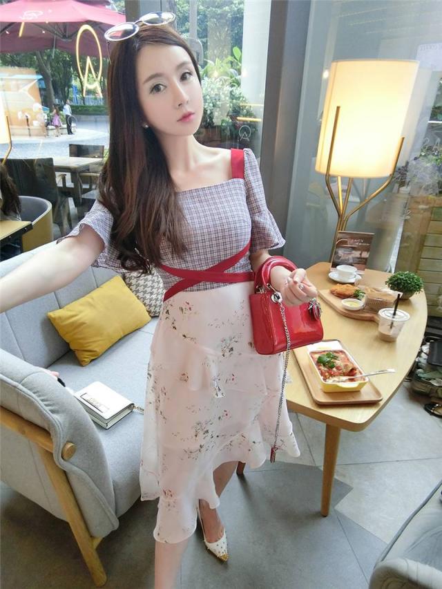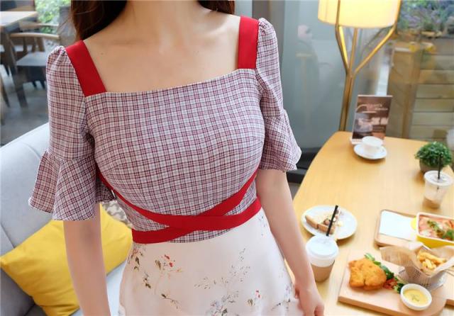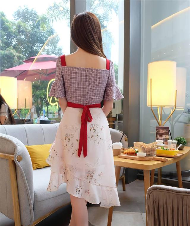 スクエアネック ワンピース 小花柄 チェック柄 切り替え フレア フリル レディース 2018年新作 定番 人気 およばれ 結婚式 二次会 演奏会
