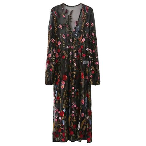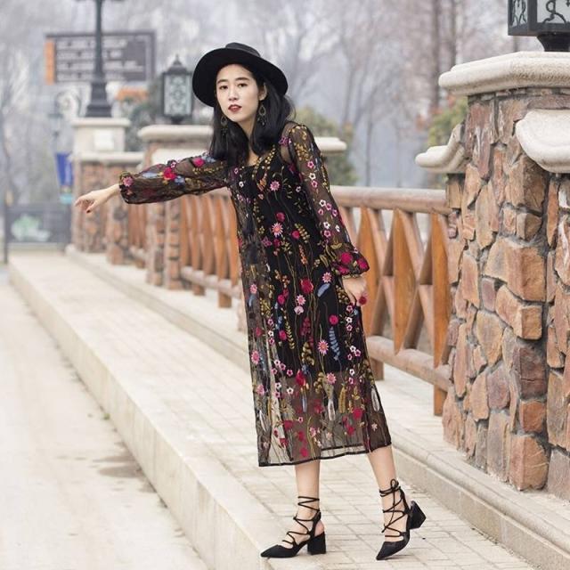 ロングドレス 黒 パーティードレス ワンピースドレス 春夏 デート 女子会 記念日 ブラック ロング丈 ミモレ丈 長袖 袖あり Aライン フレア 刺繍 レース 花柄 透け感 シースルー ラウンドネック 20代 30代 大人かわいい フェミニン ガーリー