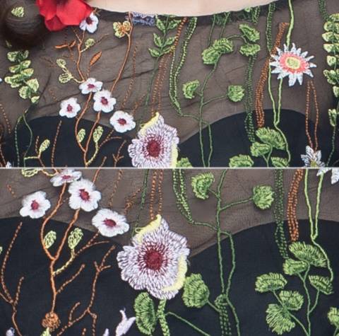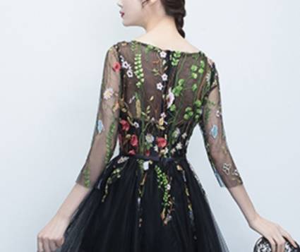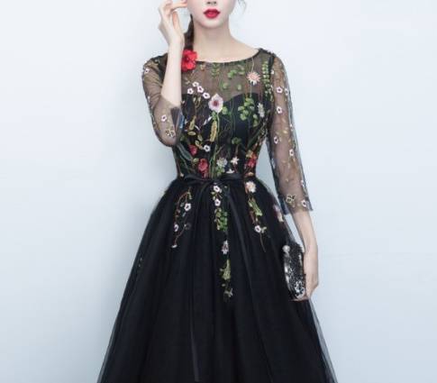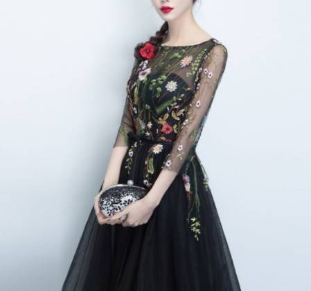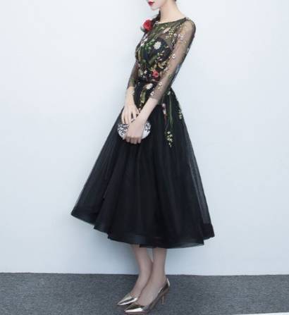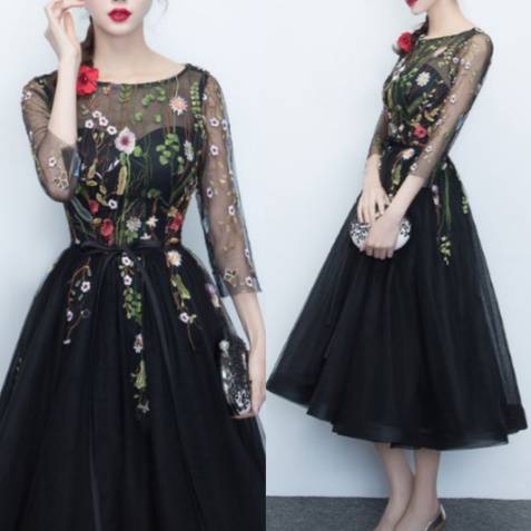 即納あり)パーティードレス 袖あり ミモレ丈 Aライン オーガンジー 花柄 刺繍 ジッパー ブラック 七分袖 フェミニン 結婚式二次会