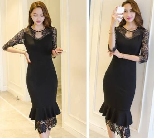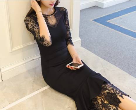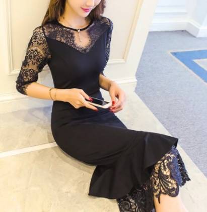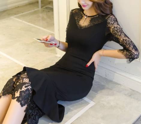 フレアワンピース 花柄 レース マーメイド 七分袖 スリム シンプル エレガント 上品 セクシー 結婚式二次会 お呼ばれ 2018年新作