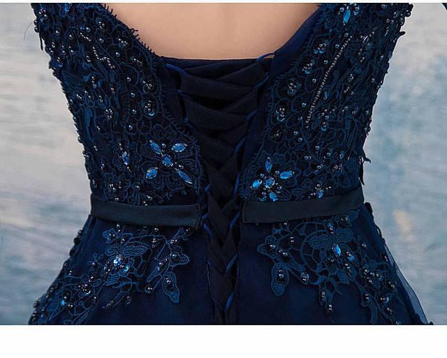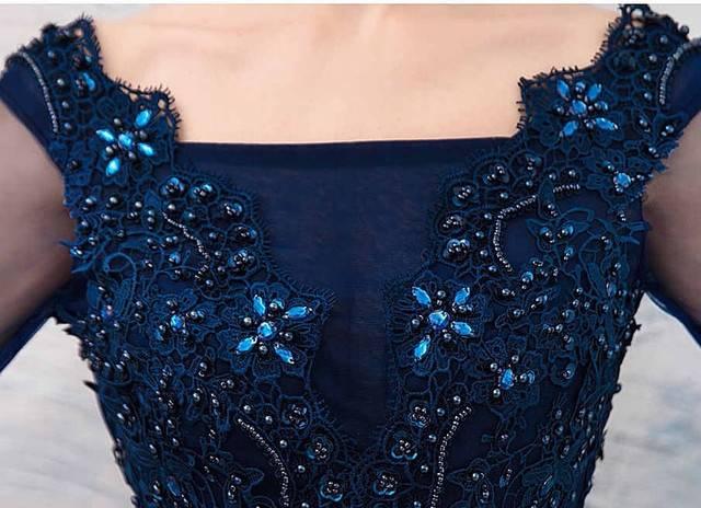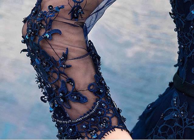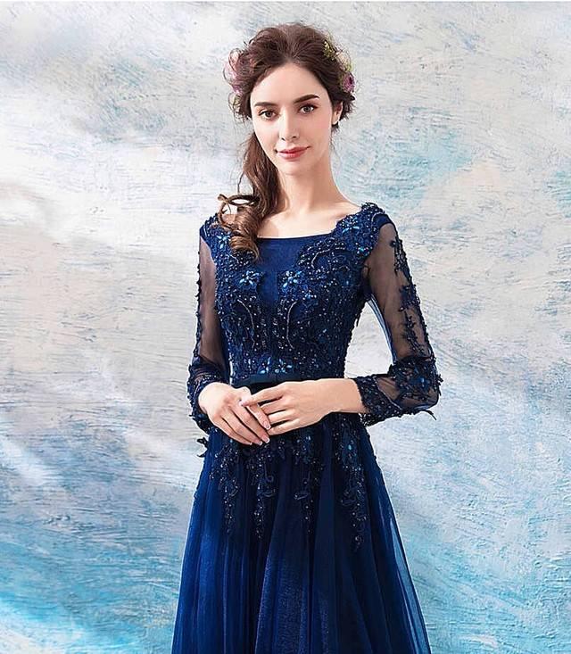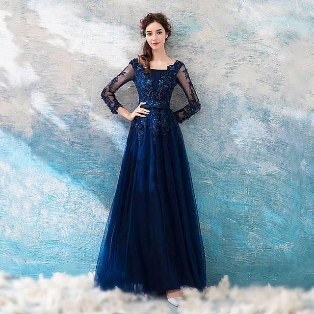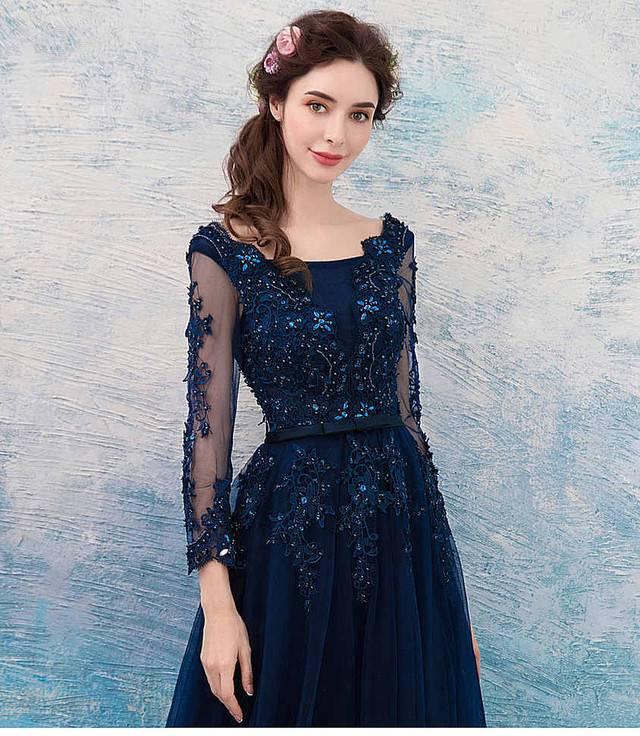 刺繍 レース ダークブルー 長袖 ロング ワンピース パーティードレス ビーズ シースルー 綺麗 おしゃれ 可愛い 上品 清楚 デート