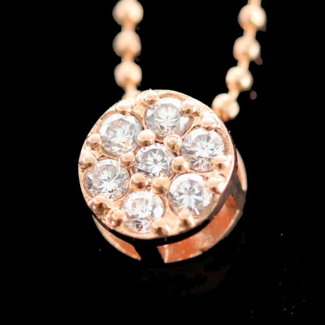 天然のダイヤモンドにも負けない輝きを持つジルコニア。最高峰のDカラーを彷彿とさせる上品さがあるクリアな光がとっても魅力的なジュエルを贅沢にも7ピースも使い、眩しく輝く1粒にまとめました。その存在感は、1ctダイヤモンドと同じ、大粒6ミリ。シンプルながらも洗練されたデザインに仕上げました。身につければ、本当に大粒1カラットのジュエルみたい…!?チェーンにはキラキラと輝くカットボールチェーンを。 約5センチのアジャスター付きで、重ね付けにもおすすめ。小ぶりのペンダントトップでラグジュアリーに…素材 :スターリングシルバー(シルバー925)/ピンクゴールドメッキ石:ジルコニア 7ピース(1粒:直径 約2.0mm)サイズ:直径 約6.0mm/高さ 約3.0mmチェーン:シルバー925 アジャスター付きカットボールチ
