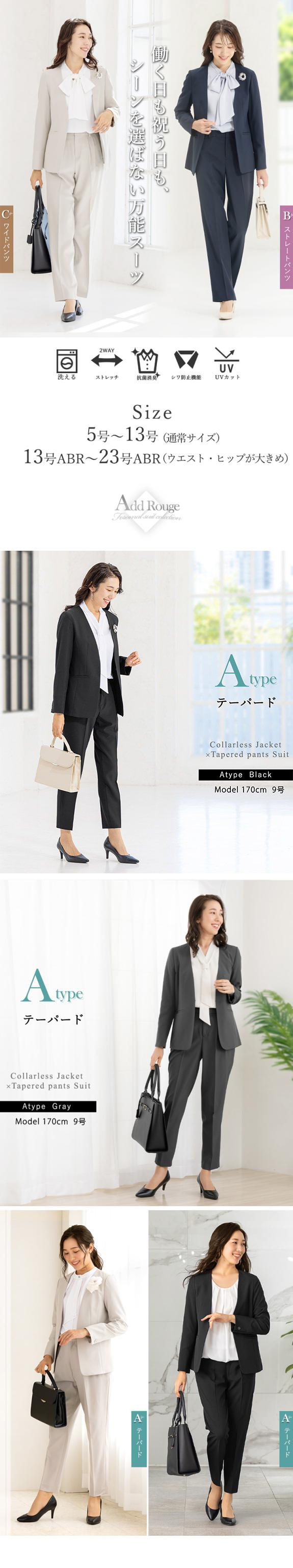 スーツ&フォーマル専門店AddRouge(アッドルージュ)は、20代・30代・40代・50代の幅広い年代の女性を対象とした、通勤スタイルから冠婚葬祭まであらゆるシーンの服装を、ご提供するレディースファッションショップです。 |
