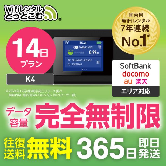 ポケットwifi レンタル 無制限 14日 au ソフトバンク docomo 日本国内専用 空港 受取 wi-fi ルーター K4 完全無制限
