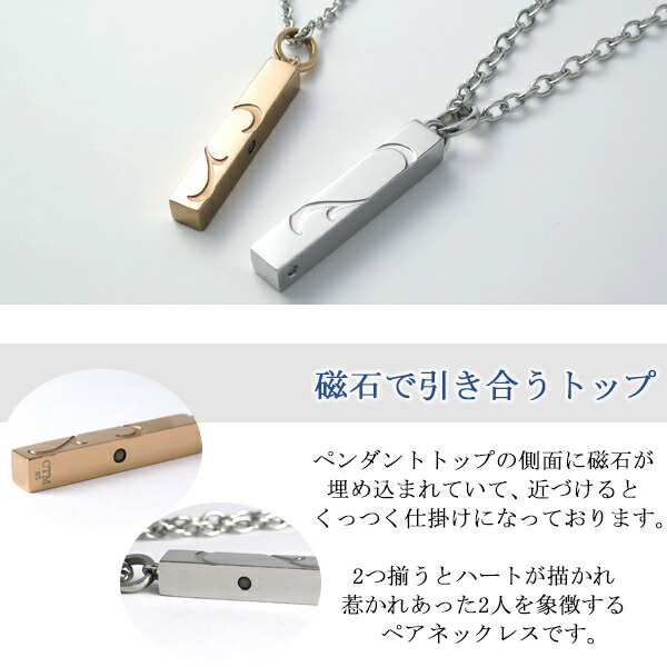 内側の磁石によって互いを引き付けハートを描くペアネックレス