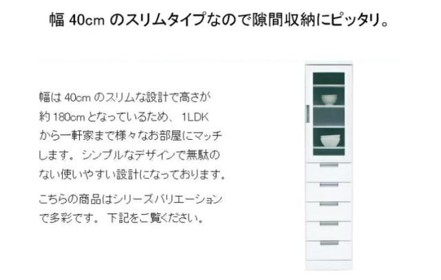 | 幅40 ガラス扉・引出5段 | 幅40 上ガラス扉・下扉 | 幅40 扉・引出5段 | 幅40cm/扉2枚 |