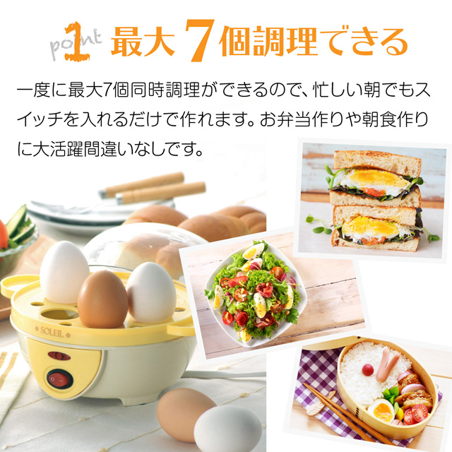 一度に最大7個同時に調理ができるので、忙しい朝でもスイッチを入れるだけでゆでたまごができます。お弁当や朝食に大活躍!