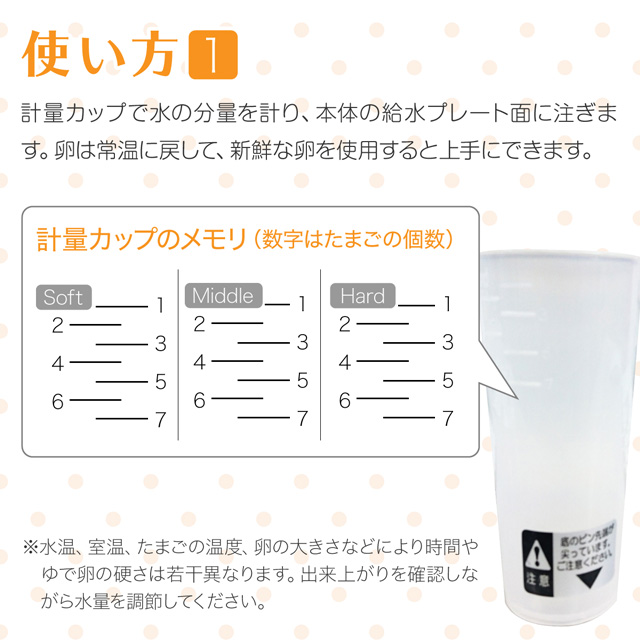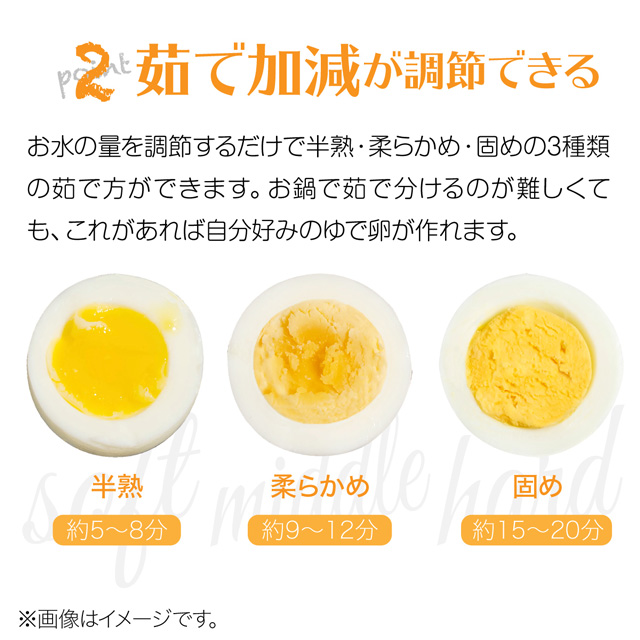 お水の量を調整するだけで半熟・柔らかめ・固めの3種類の茹で方ができます。