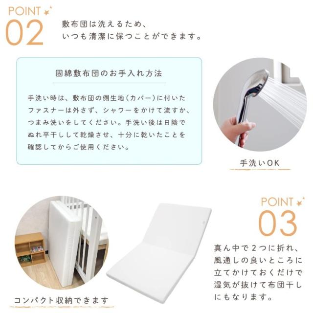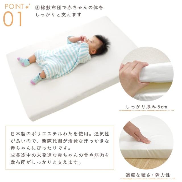 厚み約5cmのポリエステル綿を使用したベビー用固綿敷布団は、成長途中の赤ちゃんの背骨をしっかり支えてくれます。