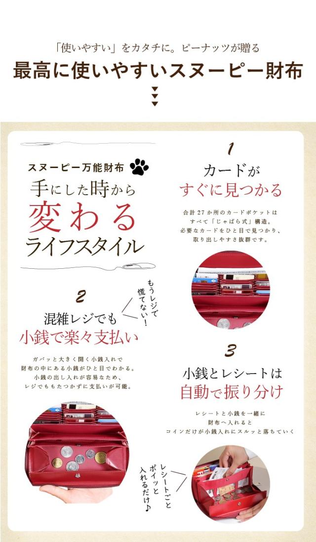 カード29枚収納可能/レシートと小銭を自動で分別するスヌーピー長財布