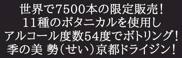 「季の美」と同じ11種のボタニカルを使用し、アルコール度数54度でボトリングした世界で7500本の限定品です(日本国内3750本、残り3750本は欧州、米国、アジアで販売)。