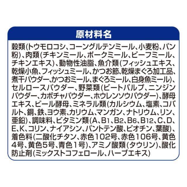 | 穀類(トウモロコシ、コーングルテンミール、小麦粉、パン粉)、肉類(チキンミール、ポークミール、ビーフミール、チキンエキス)、動物性油脂、魚介類(フィッシュエキス、乾燥小魚、フィッシュミール、かつお節、乾燥まぐろ加工品、煮干パウダー、かつおミール、まぐろミール、白身魚ミール)、セルロースパウダー、野菜類(ビートパルプ、ニンジンパウダー、カボチャパウダー、ホウレンソウパウダー)、酵母エキス、ビール酵母、ミネラル類(カルシウム、塩素、コバルト、銅、鉄、ヨウ素、カリウム、マンガン、ナトリウム、リン、亜鉛)、調味料、ビタミン類(A、B1、B2、B6、B12、C、D、E、K、コリン、ナイアシン、パントテン酸、ビオチン、葉酸)、着色料(二酸化チタン、赤色102号、赤色106号、黄色4号、黄色5号、青色1号)、アミノ酸類(タウリン)、酸化防止剤(ミックストコフェロール、ハーブエキス) |