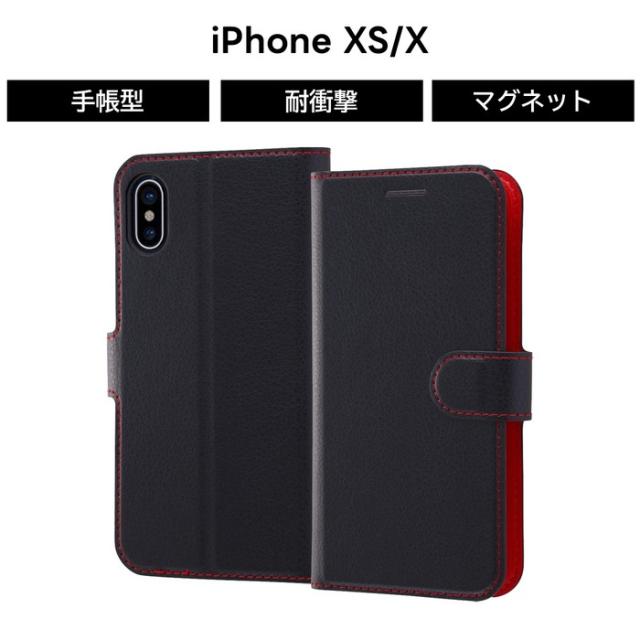 iPhoneXS iPhoneX iPhone XS X カバー ケース 手帳型 レザー 革 保護 マグネット シンプル カード入れ ポケット付き スタンド付き 収納 ベルト付き レッド