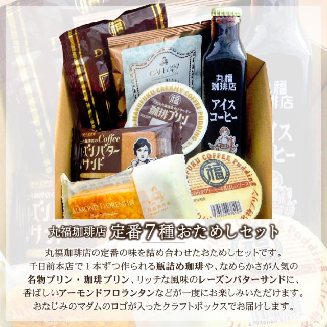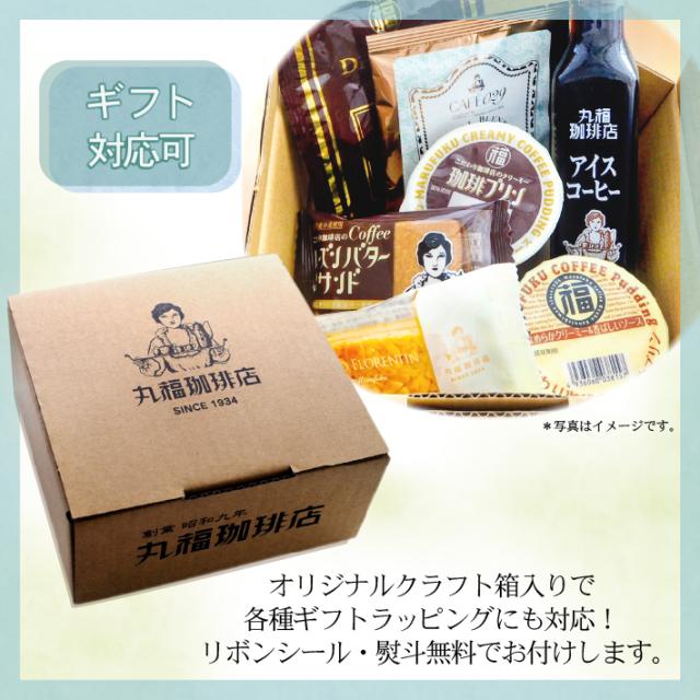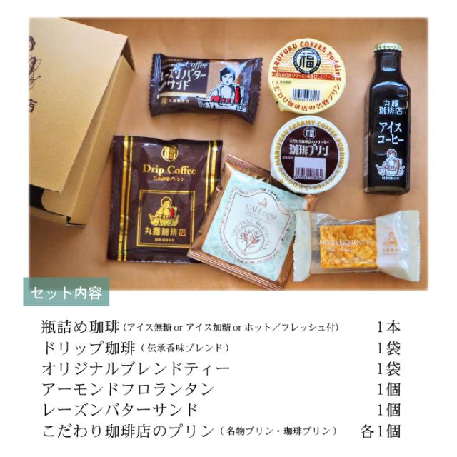 定番の瓶詰めコーヒーやドリップコーヒーに加え、人気スイーツなど、丸福の人気商品が少しずつ味わえるお試しセットです。