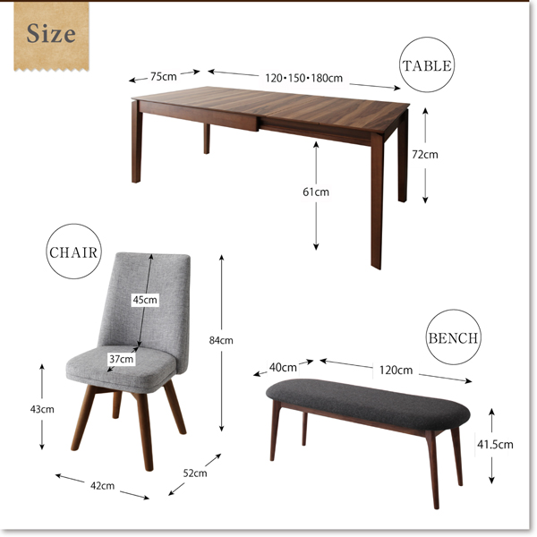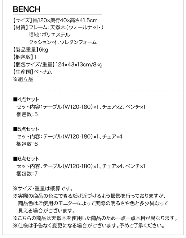 セット内容:テーブル(W120-180)×1、チェア×4、ベンチ×1