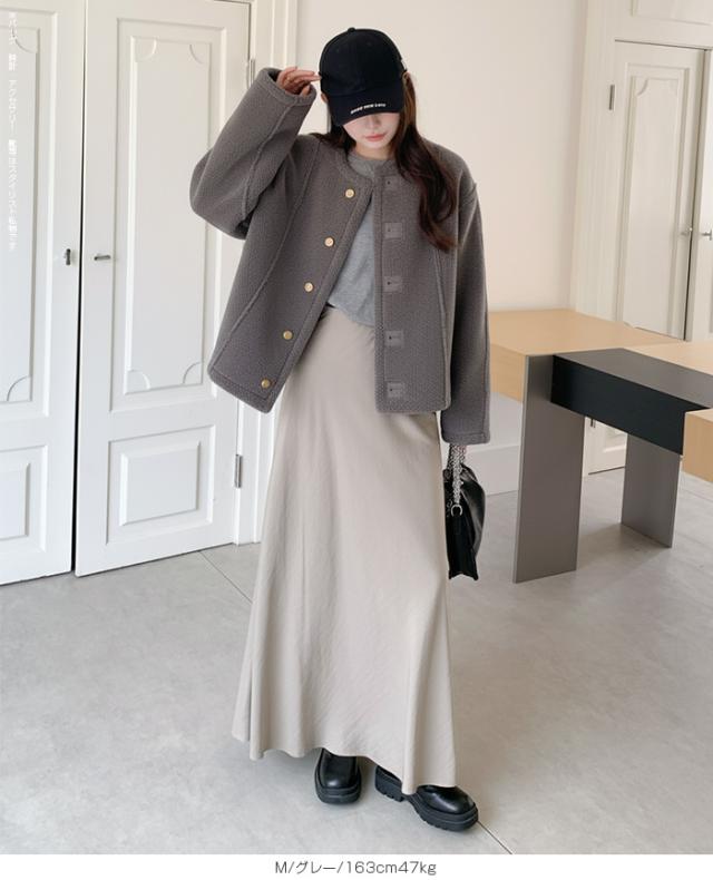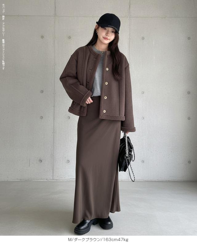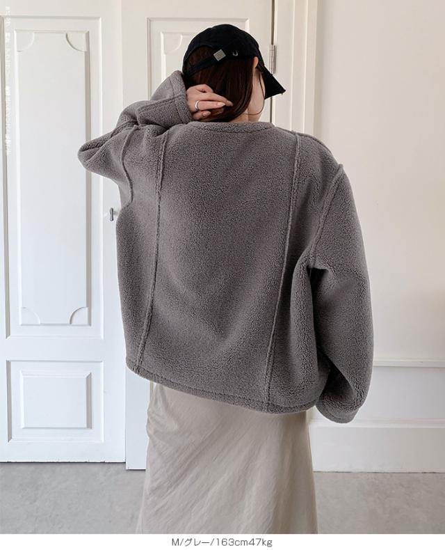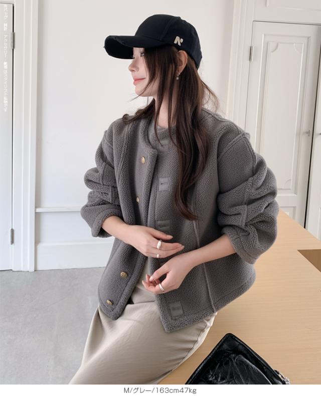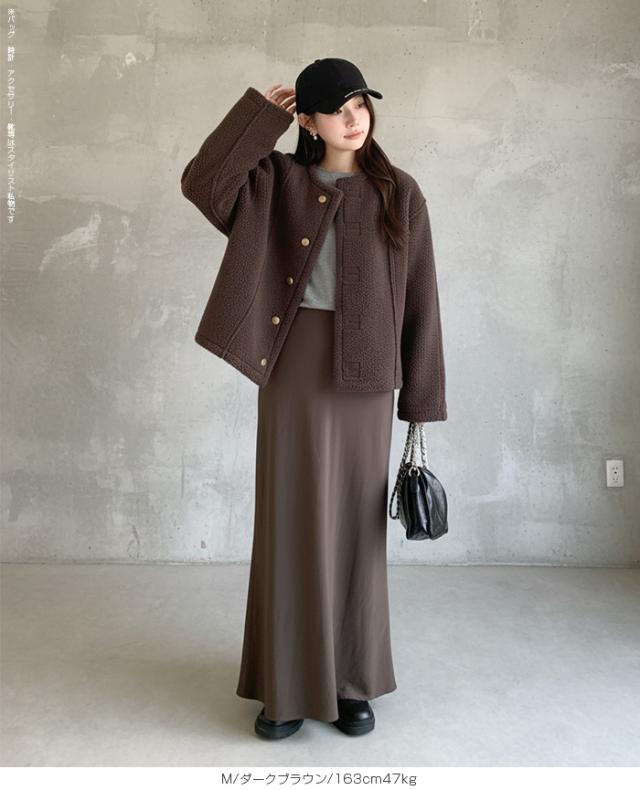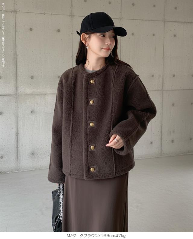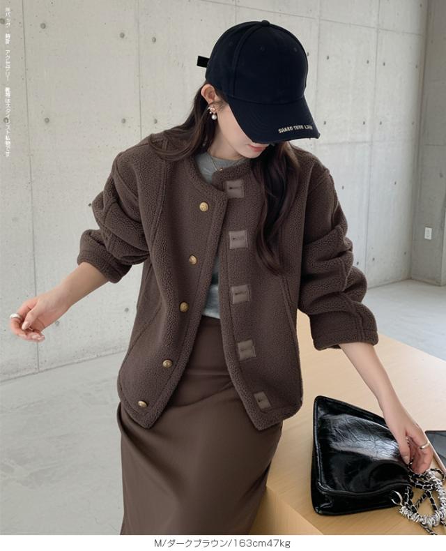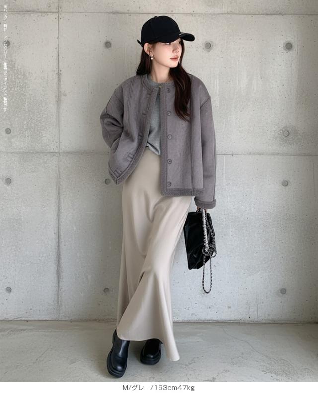 フェイクスエード×ボアのリバーシブル仕様ノーカラージャケット 肌寒い季節に欠かせない大人可愛いリバーシブルジャケット。 片面はスエード調で落ち着いた上品さを演出し、 もう片面はボアでカジュアルな暖かみをプラス。 ノーカラーデザインだからタートルやハイネックとも相性抜群。 程よいオーバーサイズシルエットで体型カバーも叶い、 デニムやワンピース、スカートとも合わせやすい優秀アウターです。 デイリーから通勤、休日のお出かけまで幅広く活躍。 20代・30代・40代女性の秋冬ワードローブにおすすめです。 【素材感・着心地】 -スエード調×ふんわりボアのリバーシブル仕様 -軽くて柔らかく、見た目以上に動きやすい -あたたかさとおしゃれを両立 【シルエット・サイズ感】 -ゆったりとしたオーバーサイズで旬な着こなしに -ヒップにかかるショート丈で脚長効果◎ -ノーカラーですっきりとした首回り |