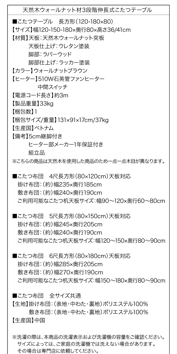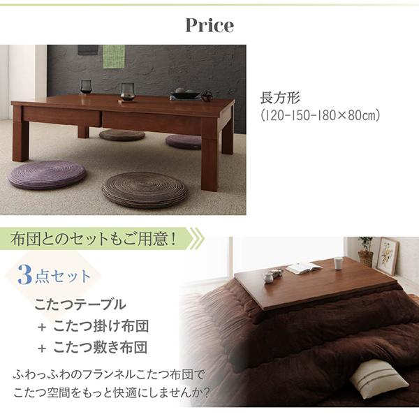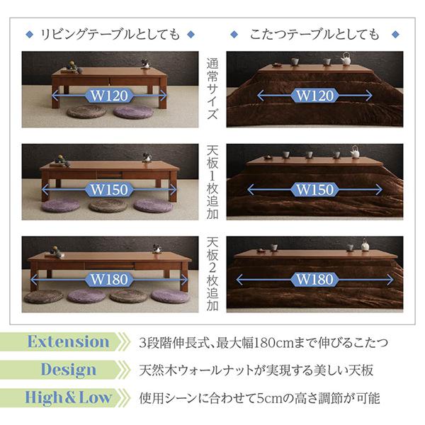 天然木ウォールナット材3段階伸長式こたつテーブル 〔Widen-Wal〕ワイデンウォール こたつテーブル単品 長方形(80×120〜180cm) ウォールナットブラウン 【北海道・沖縄・離島配送不可】
