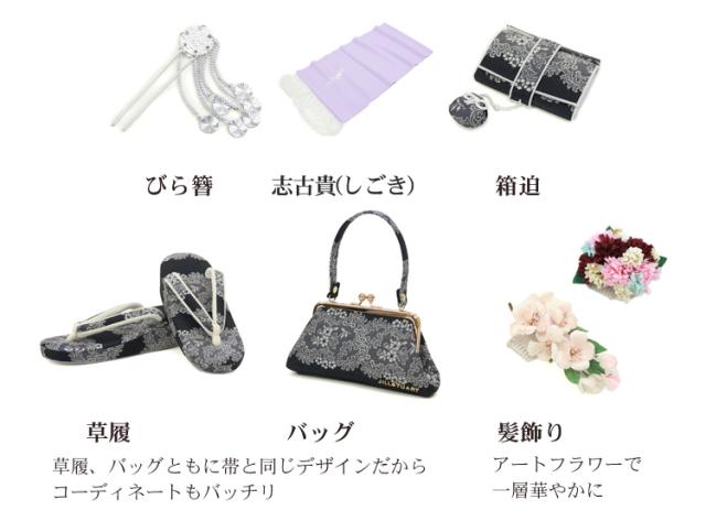 | 四つ身着物・作り帯・長襦袢・半衿・重ね衿・帯揚げ・帯締め・志古貴・草履・バッグ・髪飾り 箱迫・びら簪・肌着・裾除け・伊達締め2本・腰紐2本・コーリンベルト2本・足袋 | |||