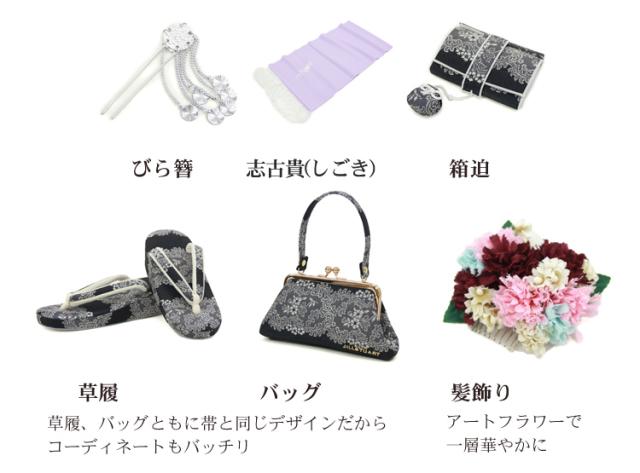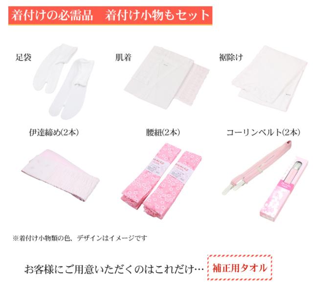 | 四つ身着物・作り帯・長襦袢・半衿・重ね衿・帯揚げ・帯締め・志古貴・草履・バッグ・髪飾り 箱迫・びら簪・肌着・裾除け・伊達締め2本・腰紐2本・コーリンベルト2本・足袋 | |||