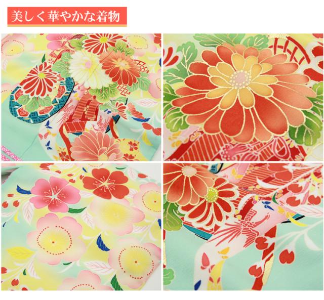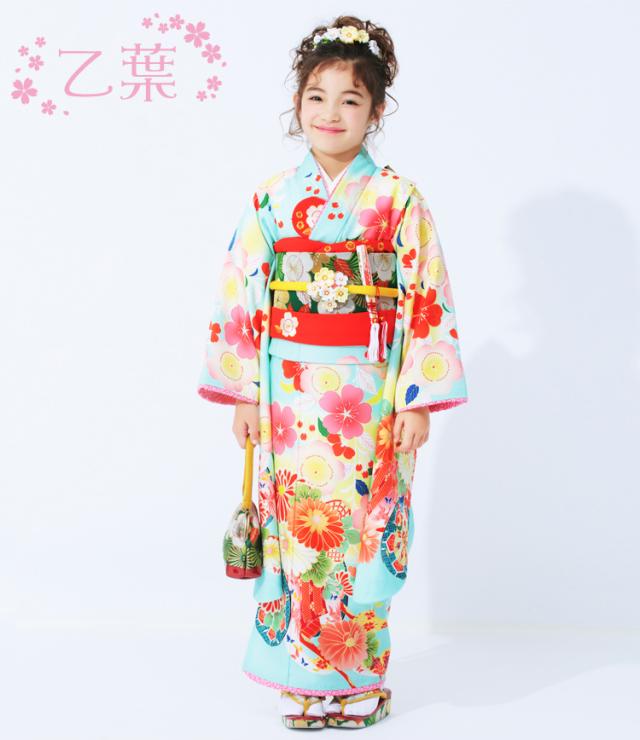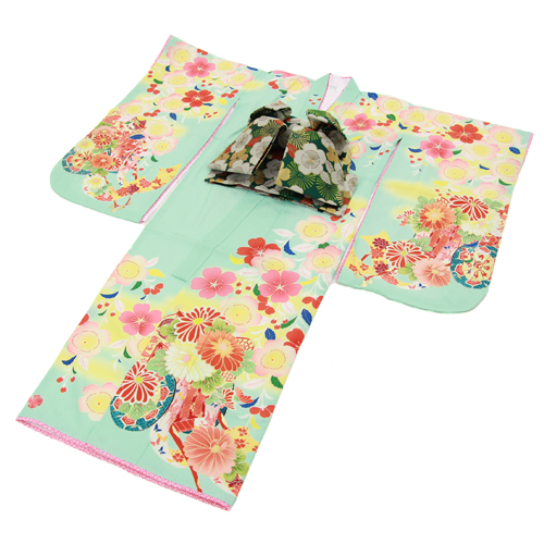 四つ身着物23点セットレンタル「水色地に花車と桜」乙葉 女の子 ひな祭り 衣装 着物 雛祭り お正月 結婚式 発表会 晴れ着