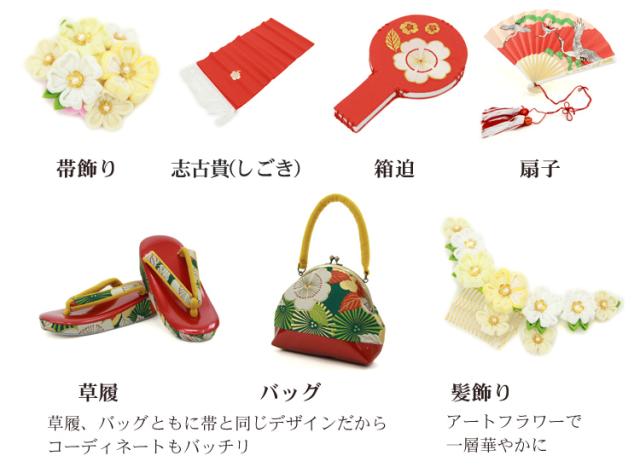 | 四つ身着物・作り帯・長襦袢・半衿・重ね衿・帯揚げ・帯締め・志古貴・草履・バッグ・髪飾り 箱迫・帯飾り・扇子・肌着・裾除け・伊達締め2本・腰紐2本・コーリンベルト2本・足袋 | |||
