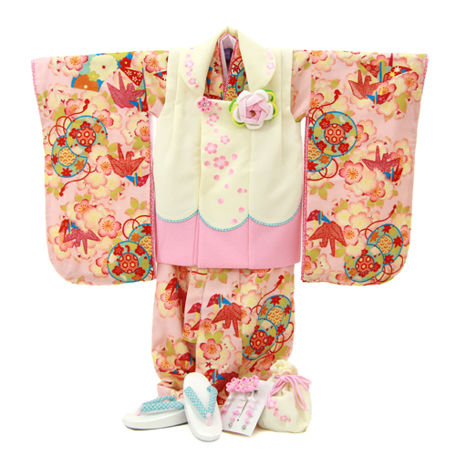 七五三 着物 3歳 レンタル 女の子 被布着物10点セット「ピンク地に折鶴と桜/被布:白」乙葉 被布セット モダン レトロ