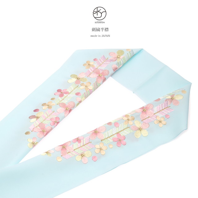 半襟 刺繍 振袖 成人式 半衿 水色 ライトブルー カラフル 梅 うめ 花 矢羽根 新合繊 シルエリー 和装小物 女性 レディース 日本製