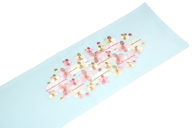 正絹のような艶やかな生地に、色鮮やかで豪奢な金属糸や刺繍糸で、梅の花に、矢羽根が艶やかに刺繍されています。