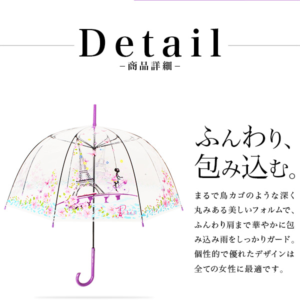 ふんわり肩まで包み込み雨をしっかりガード。大人の女性が持てる、ファッション性重視の上品なビニール傘です。