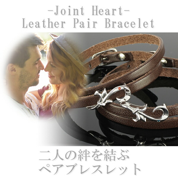 本革のレザーに蔦模様のシルバーパーツを飾った、2重巻きのペアブレスレットです。互いの蔦模様を並べると、ハートの形が浮かび上がります。