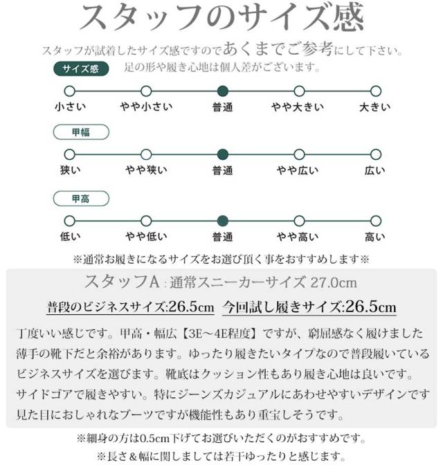 | 【サイズ】 | 25.0cm 25.5cm 26.0cm 26.5cm 27.0cm 28.0cm 29.0cm ヒールの高さ/3cm 筒の長さ/12cm 履き口の広さ/約27cm (26cmで計測) (サイドゴムなので通常27.0cmで伸ばした時点が約33cmあります) |