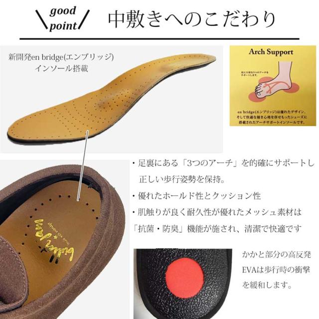 | 【商品説明】 | アッパー素材には、上品かつ、足に馴染みやすい柔らかなフェイクスエード素材を使用しアウトソールにはクレープ調合成ゴムを使用しています。 永遠の定番ブーツのミドルカット版。 シンプルなのに斬新なデザインはどんな装いにも合わせやすさ抜群 長時間歩いても疲れにくいのが魅力。 着用するほどに足になじみ、風合いの変化を楽しむことができます。 ジーンズやチノ、ワークパンツなどどんなボトムにも合わせやすく、デイリーに活躍してくれます。 ■新開発en bridge(エンブリッジ)インソール搭載 ・足裏にある「3つのアーチ」を的確にサポートし、正しい歩行姿勢を保持。 ・優れたホールド性とクッション性でアクティブなシーンで最適な履き心地を実現。 ・肌触りが良く耐久性が優れたメッシュ素材は「抗菌・防臭」機能が施され、清潔で快適です。 ■アーチサポートの役割 直立時や歩行時に足裏を支え、姿勢を正しく安定させます 足に加わる衝撃を吸収および緩衝させます 歩いたり走ったりする時、足に加わる衝撃を足裏全体に分散させて、身体のバランスをサポートします ※【足入れに付いて】※ 若干甲が低めの設定になっております。 通常の41インチ〜45インチよりも1サイズ小さ目ですのでワンサイズ大き目をお選びいただく事をお勧めいたします。 |