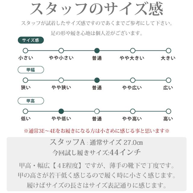 | 【サイズ】 | 41インチ (約25.0cm〜25.5cm) 42インチ (約25.5cm〜26.0cm)) 43インチ (約26.0cm〜26.5cm) 44インチ (約26.5cm〜27.0cm) 45インチ (約27.0cm〜27.5cm) ※1サイズ小さめの作りです。※ 表記なし:3E相当 |