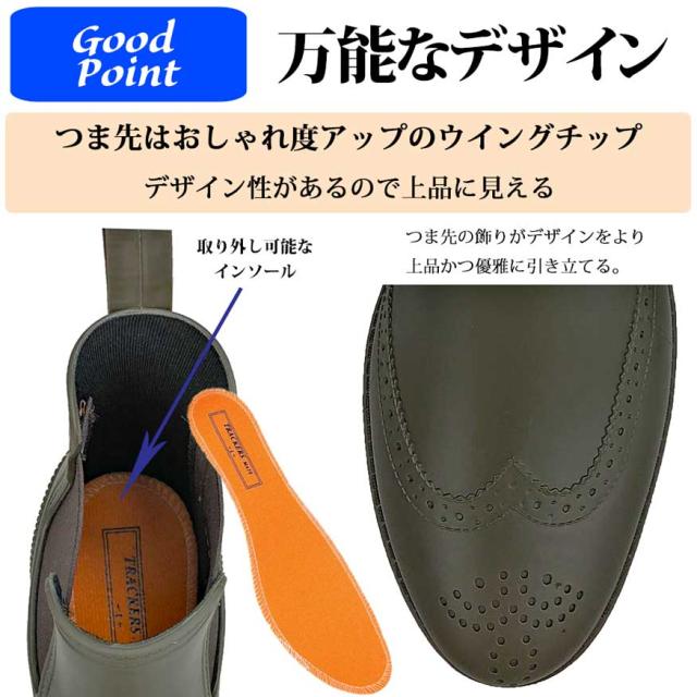 | 【商品説明】 | ・スーツにもカジュアルにもタイプできる、ウィングチップデザインが魅力 サイドゴアショートレインブーツです。 ・定番人気のサイドゴアタイプで脱ぎ履きもしやすく足にフィットして歩きやすい。 ・一体成型の完全防水なので靴の中に水が入らず大雨でも安心。 ・防滑ソールで滑りにくく、機能性もバツグンの優秀アイテムです。 【注意】 サイドゴムですので両サイドのゴムの部分より水等がしみ込む事がございます。 ご使用前に撥水もしくは防水スプレーの散布をお勧めいたします。 ビジネスレインとしても大活躍しそうです。 |