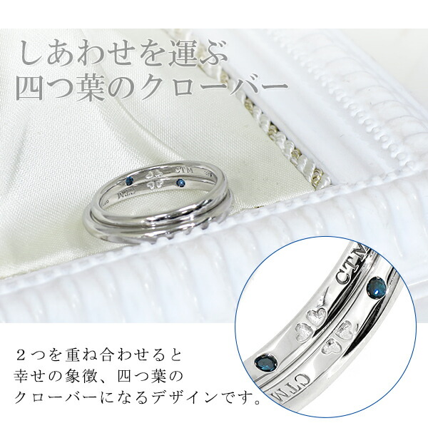 内側にはそれぞれブルーダイヤモンドが一粒ずつ施され、2つを重ね合わせると幸せの象徴、四つ葉のクローバーになるデザインです。