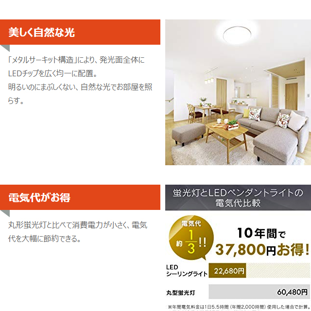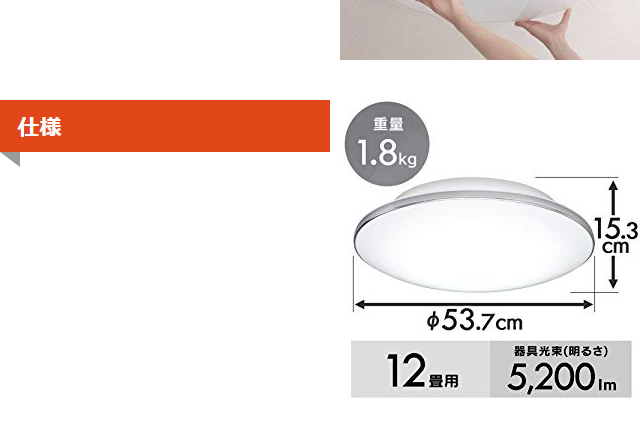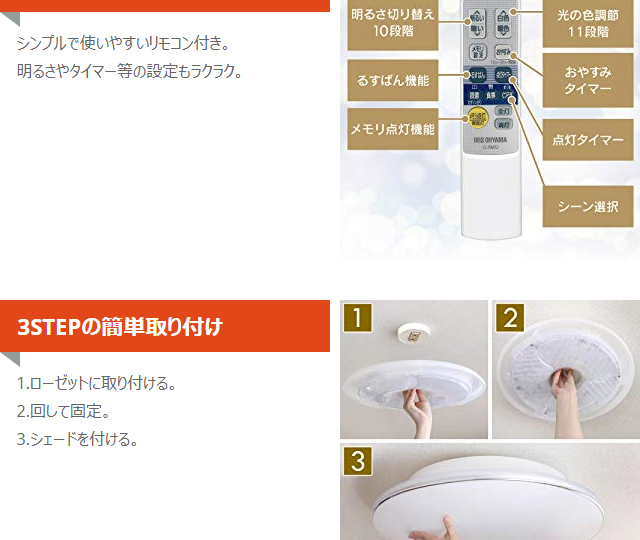 LEDシーリングライト本体、取り付け用スペーサー(角)、取り付け用スペーサー(丸)、リモコン、リモコンホルダー、単3形乾電池:2本、ネジ:2本、取扱説明書、保証書