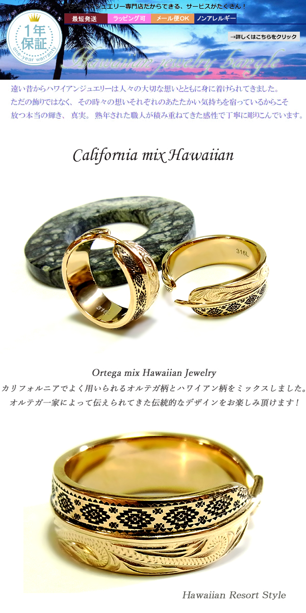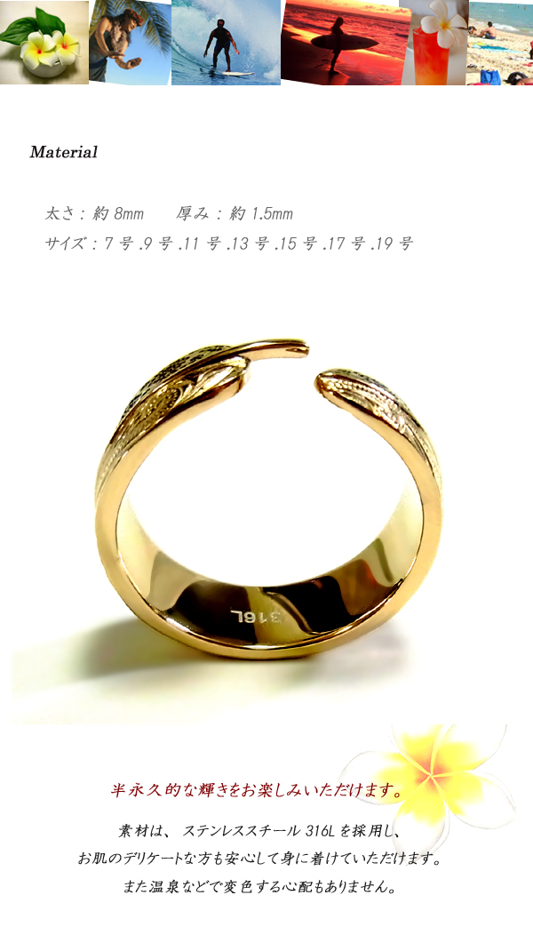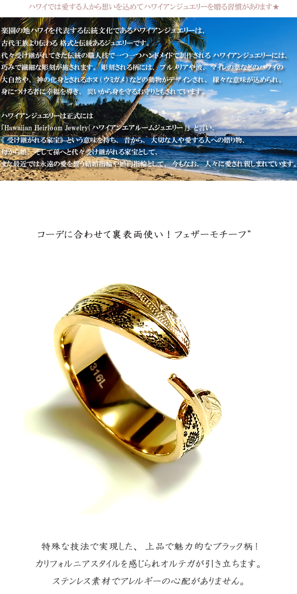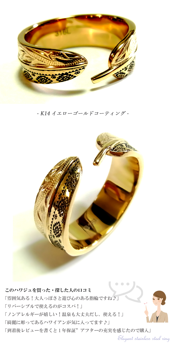 ハワイアンジュエリー リング メンズ レディース K14イエローゴールドコーティング フェザー オルテガ柄 ラッピング対応 アレルギー対応 ペアリング セットにも