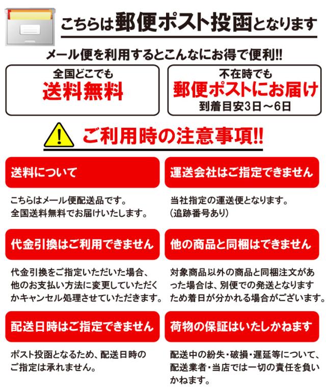 メール便(郵便ポスト投函)の為、代金引換はご利用いただけません。