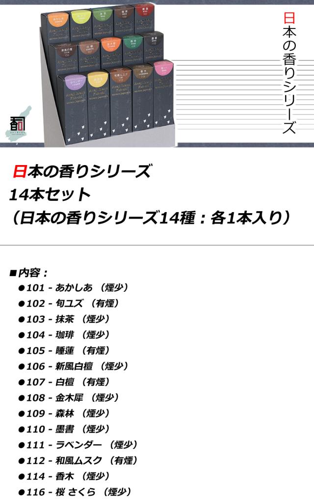 ■セット内容:14本セット(日本の香りシリーズ14種:各1本入り)(原材料等調合の具合により、香りの種類によってお香のサイズが異なります。