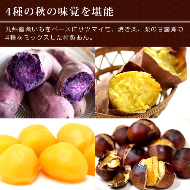 | 原 材 料 | 小麦粉、砂糖、白いんげん、糖蜜(砂糖、ハチミツ、パイン、レモン)、栗砂糖漬、植物油脂、紫芋ペースト、栗甘露煮ダイスカット、水飴、ラード、卵/糊料(加工澱粉)、膨張剤、酸化防止剤(V.C、V.E、EDTA-Ca-Na)、着色料(クチナシ)、漂白剤(亜硫酸塩)、(原材料の一部に卵、大豆を含む) |