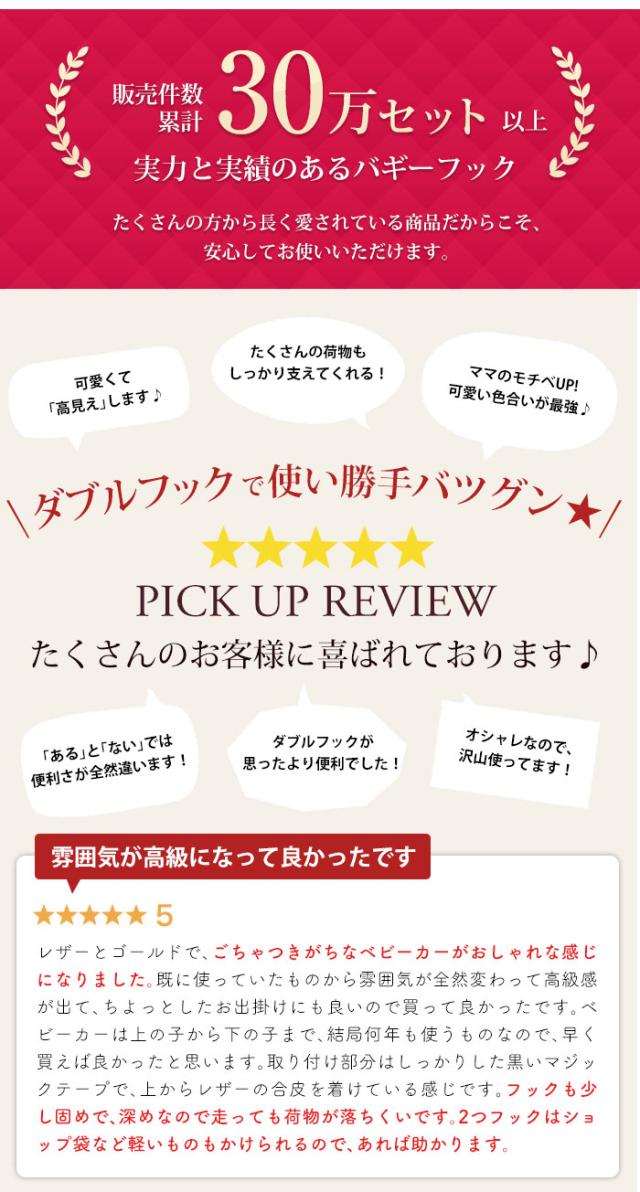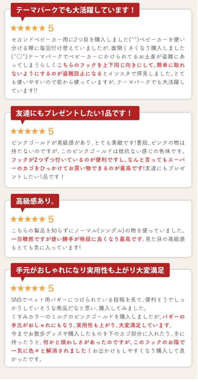 - ベビーカーでのお出かけが増えてきたのでかわいいバギーフックが欲しいなと探していたところ見つけてすぐ買いました。シンプルなので馴染んで使いやすい!ベビーカー周りの小物がかわいいとお出かけも気分あがる?