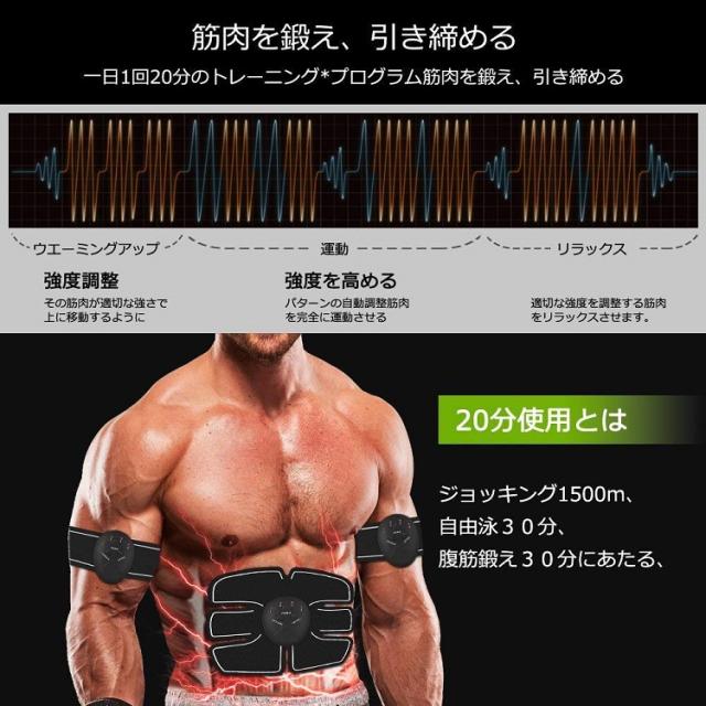 商品サイズ: ボディーパッド:18.7*17.3cm 腕パッド:18.6*6.8cm ジェルシート:4*6cm セット内容: 腹部パッド*1、腕部パッド*2、コントローラー本体*3、ジェルシートは本体に貼り付けしてあります。 電源:コントローラー1つにつき、単4型乾電池2本使用。(乾電池は付属いたしません) 「EMSダイエットマシンでたった20分」 1500mのジョギング、30分の水泳、30分の腹筋運動と同じだけの効果を得ることができます。また、使用者に合わせて強度が変更できますので、老若男女問わずご使用頂けます。使用方法はとても簡単で、家で読書や家事をしながら、或いは出張先や旅行先でも使用可能なems fitnessです。 「誰でも簡単に」 本製品は自宅で【手軽に】筋肉を鍛えることができるEMSマシンです。腹筋を中心に、腕や足などの鍛えたい部分に貼るだけで、電流が筋肉を刺激して動かすことで誰でも簡単に鍛えることができます。 「コンパクトで使いやすい」 好きな場所にパッドを貼ってスイッチを押すだけ!10段階の強度と6つモードの調節を搭載されていますため、強度はお好きに自分なりに調節していただけます。電気コードもありませんので、テレビを見ながらリラックスタイムに、勉強・仕事中や家事をしながらと、いつでもどこでも自在に鍛えることができます。 「肌に優しい」身体のラインにフィットする柔らかさを可能に、皮膚のような薄さを設計されて効率的なトレーニングを得られます、パッドの粘着力があり皮膚に優しい素材で作られた高電動ジェルシートを採用しているため、肌に良くフィットします。 |