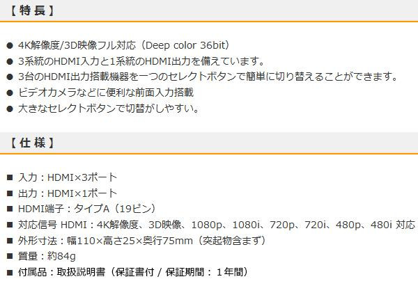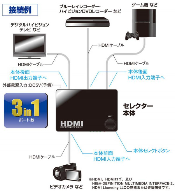 | ブルーレイレコーダー、ゲーム機、ビデオカメラなど、3台のHDMI機器をボタンひとつでカンタンに切り換えできます。 |