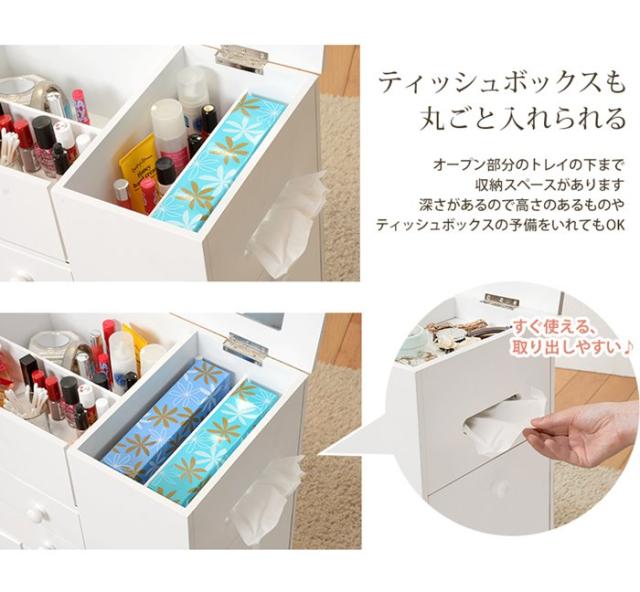 メイク道具や化粧用品が全てしまえる大容量のコスメワゴン、ボックスティッシュ収納やダストボックス付きで散らかりません。