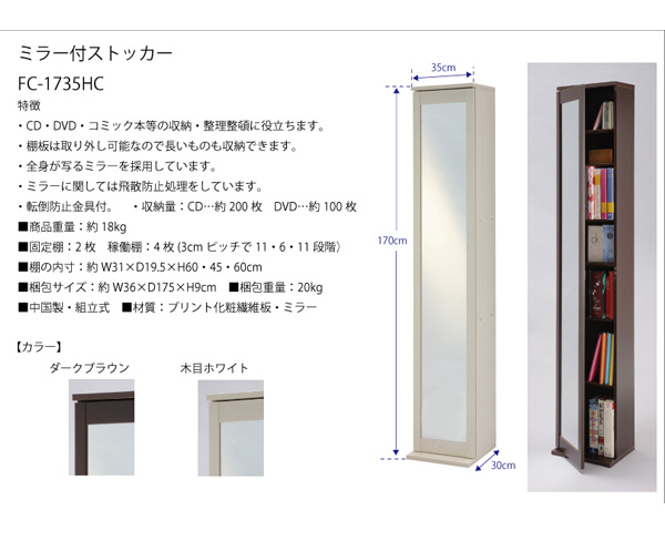 | ■CD,DVD,コミック本等の収納にぴったりです。 ■棚板は取り外し可能なので、棚の高さを変えられます。 ■ミラーは全身が移るサイズを採用。 ■ミラーは飛散防止処理済。 ■転倒防止金具付属。 | ||||||||||||