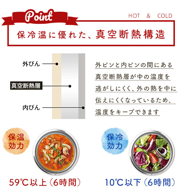 | 商品説明 | いつものランチにスープをプラス! 真空断熱構造でおいしく保温できる、ステンレス製のスープジャー500mlです。 保温だけでなく保冷もできるので、冷たいフルーツやデザートなどをおいしく持ち運べます。 保温効果を高めるために、熱湯を入れて予熱すると中身が冷めにくくなります。 |